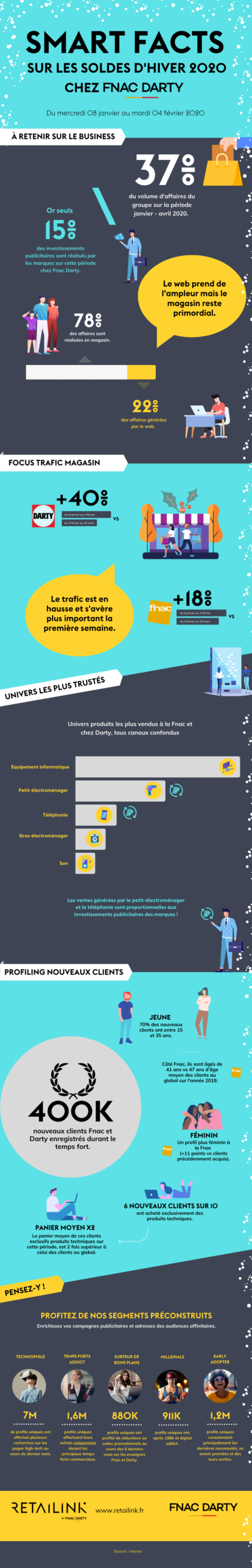 Les soldes d’hiver inaugurent l’année avec un lot important de bons plans pour tous les goûts chez Fnac et Darty. Et bien que le contexte sanitaire fasse bouger les lignes, l’analyse de l’activité 2020 nous révèle que l’opération reste encore sous-exploitée par les marques. En effet, sur les 4 premiers mois de l’année les soldes d’hiver représentent seulement 15% des investissements en communication, alors que ce temps fort représente 40% du business généré sur ce quadrimestre et l’arrivée de 400 000 nouveaux clients.