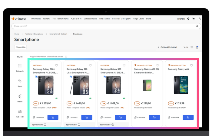 L’Italie, où Fnac Darty opère via son partenaire Unieuro, n’est pas en reste. Samsung a également déployé une campagne e-retail sur un format publicitaire natif équivalent au Full Product.
